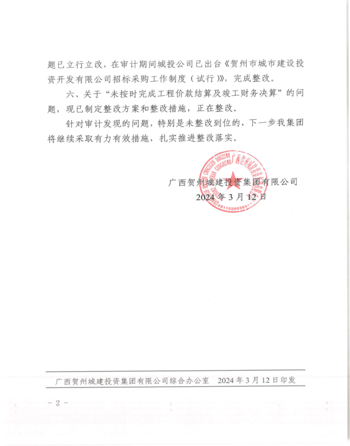 賀州市城市品質(zhì)提升改造工程財(cái)務(wù)收支及項(xiàng)目執(zhí)行情況審計(jì)整改情況公告