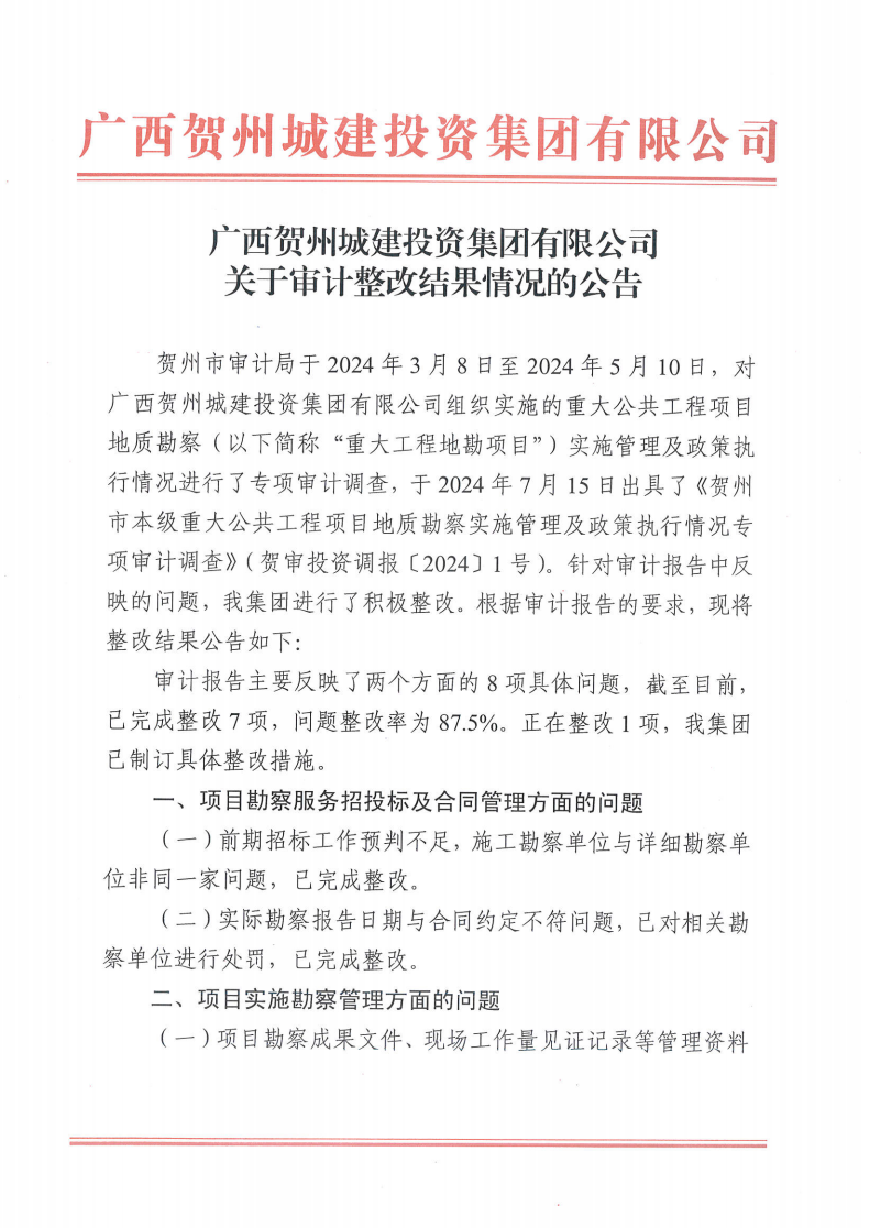 廣西賀州城建投資集團(tuán)有限公司關(guān)于審計整改結(jié)果情況的公告
